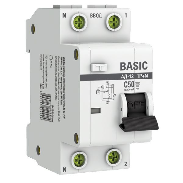 Наименование в каталоге Выключатель автоматический дифференциальный 1P+N 50А 30мА электронный тип АС C 4.5кА АД-12 Basic