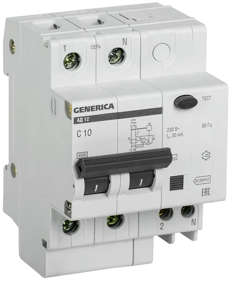 Наименование в каталоге Выключатель автоматический дифференциальный АД12 2Р 10А 30мА GENERICA