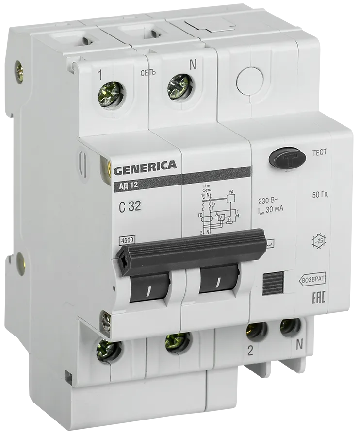 Наименование в каталоге Выключатель автоматический дифференциальный АД12 2Р 32А 30мА GENERICA