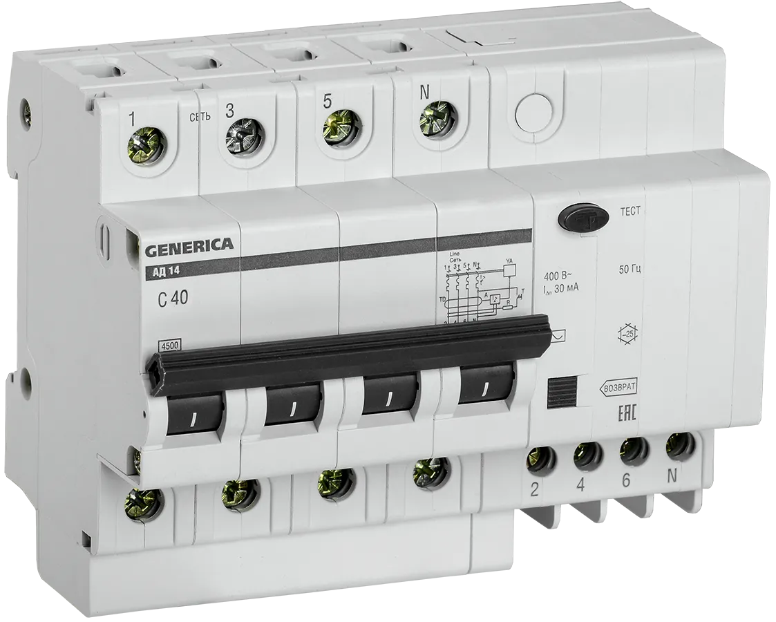 Полные технические характеристики Выключатель автоматический дифференциальный АД14 4Р 40А 30мА GENERICA IEK (ИЭК) MAD15-4-040-C-030