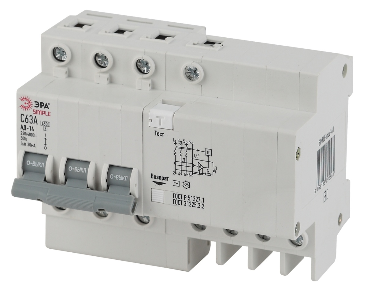 Полные технические характеристики Автоматический выключатель дифференциального тока S SIMPLE-mod-39 АД-14 (AC) C40 30mA 6кА 3P+N ЭРА Б0039297