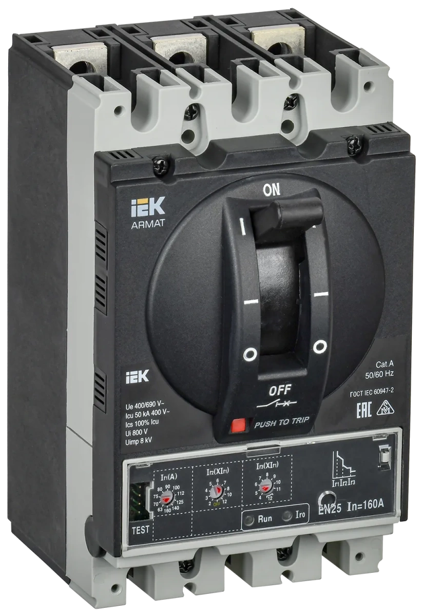 Полные технические характеристики ARMAT Автоматический выключатель в литом корпусе 3P типоразмер D 50кА 160А расцепитель электронный стандартный IEK (ИЭК) AR-MCCB-3D-050-0160A-ELSC