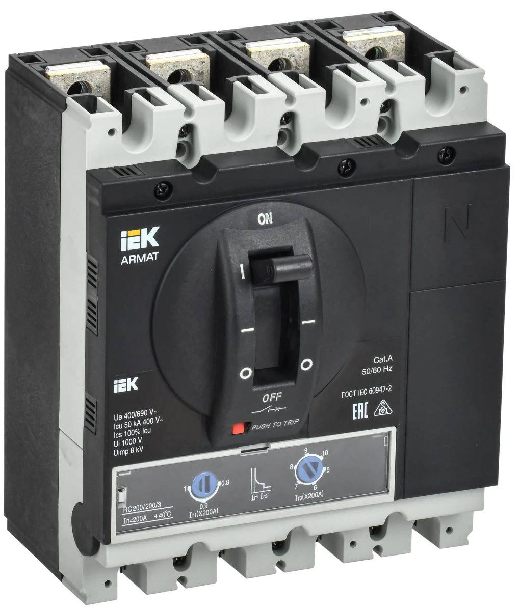 Полные технические характеристики ARMAT Автоматический выключатель в литом корпусе 4P типоразмер G 50кА 200А расцепитель термомагнитный регулируемый IEK (ИЭК) AR-MCCB-4G-050-0200A-ATUC