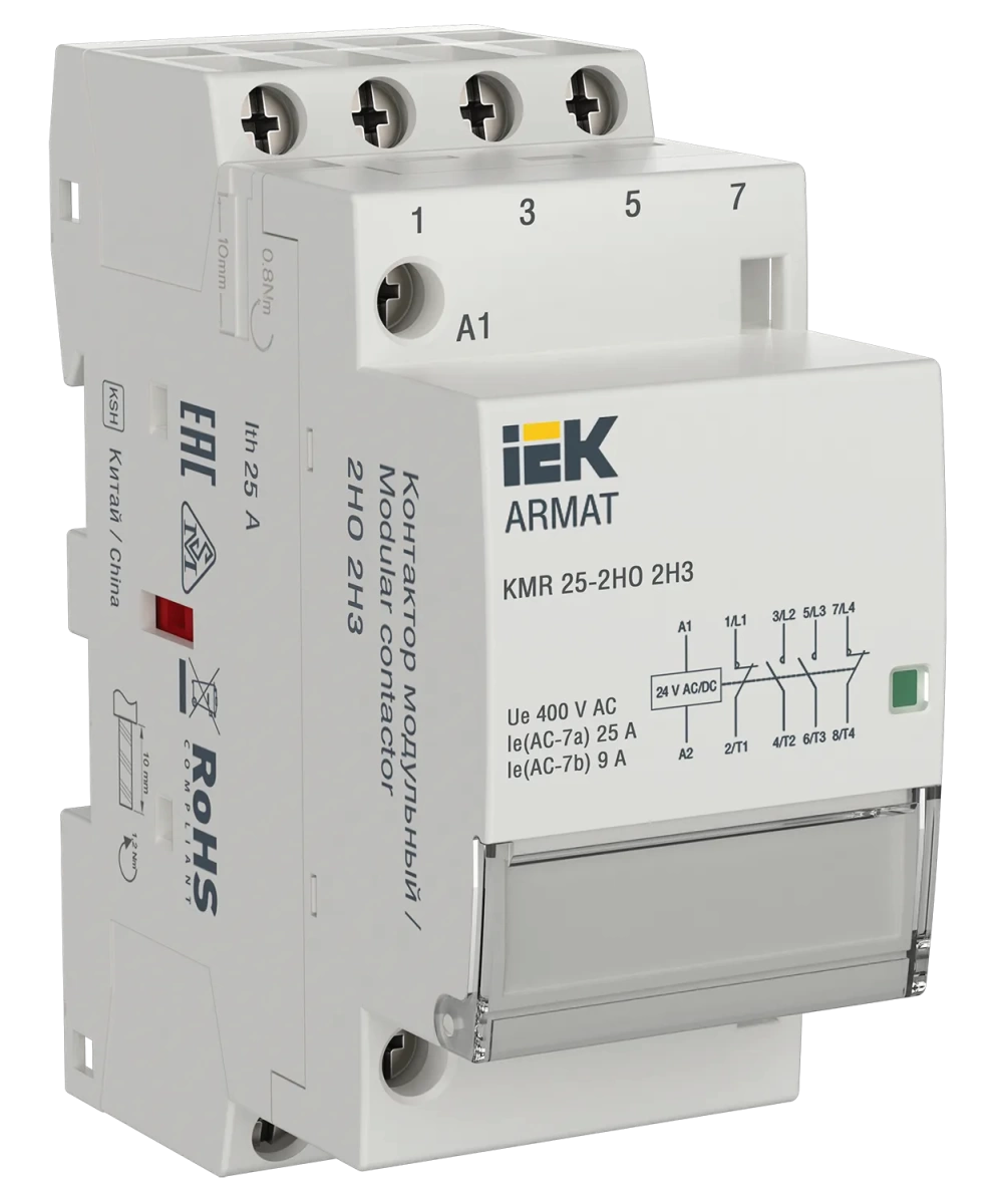 Наименование в каталоге ARMAT Контактор модульный KMR 25А 24В AC/DC 2НО 2НЗ IEK