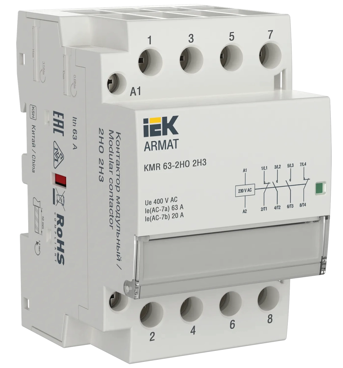 Наименование в каталоге ARMAT Контактор модульный KMR 63А 230В AC 2НО 2НЗ IEK