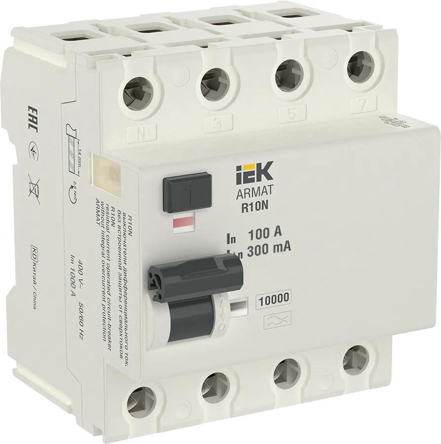 Полные технические характеристики ARMAT Выключатель дифференциального тока R10N (УЗО) 4п 100А 300мА тип A IEK (ИЭК) AR-R10N-4-100A300