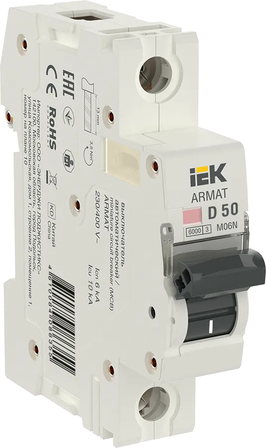 Полные технические характеристики ARMAT Выключатель автоматический однополюсный D 50А M06N IEK (ИЭК) AR-M06N-1-D050