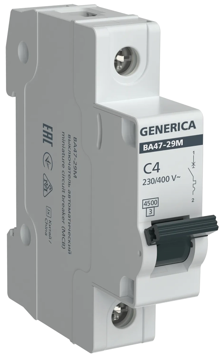 Наименование в каталоге Автоматический выключатель ВА47-29М 1P 4А 4,5кА C GENERICA