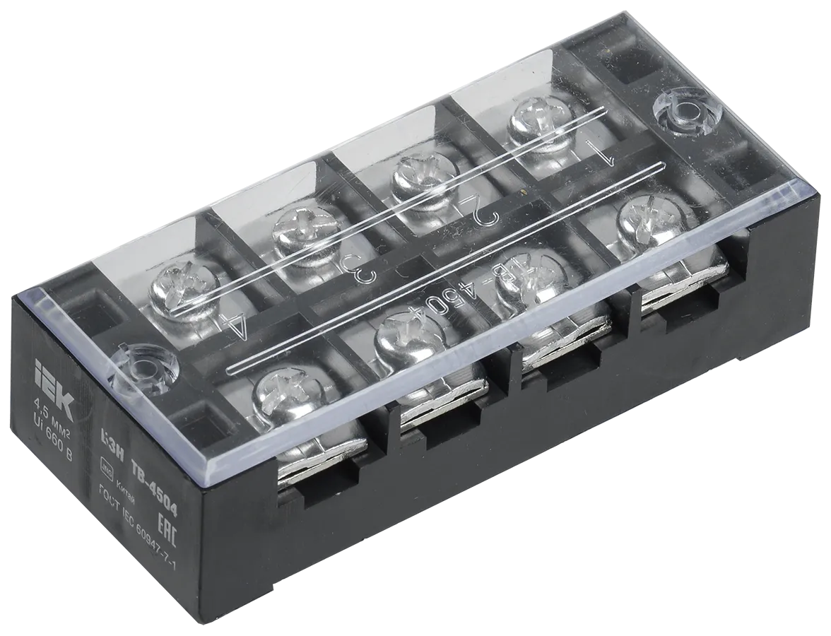 Полные технические характеристики Блок зажимов БЗН ТВ-1004 10 мм2 100A 4 пары IEK (ИЭК) YZN41-04-010-K02