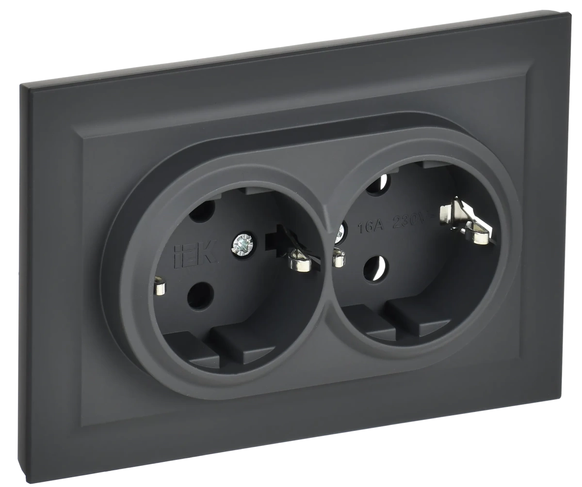 Полные технические характеристики BRITE Розетка двойная с заземлением без защитных шторок 16А в сборе РС12-3-БрГ графит IEK (ИЭК) BR-R21-16-K53-F