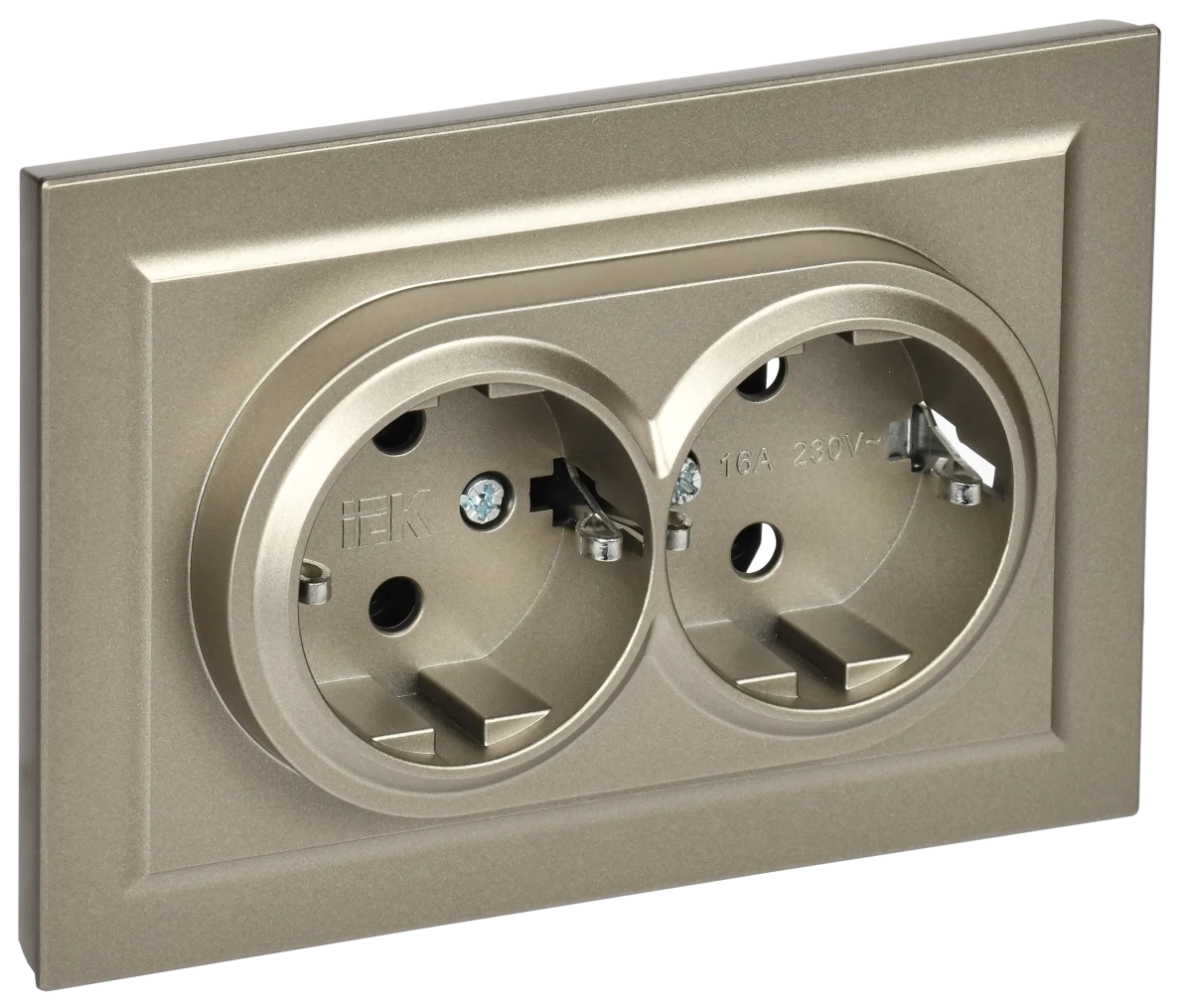 Полные технические характеристики BRITE Розетка двойная с заземлением без защитных шторок 16А в сборе РС12-3-БрШ шампань IEK (ИЭК) BR-R21-16-K37-F