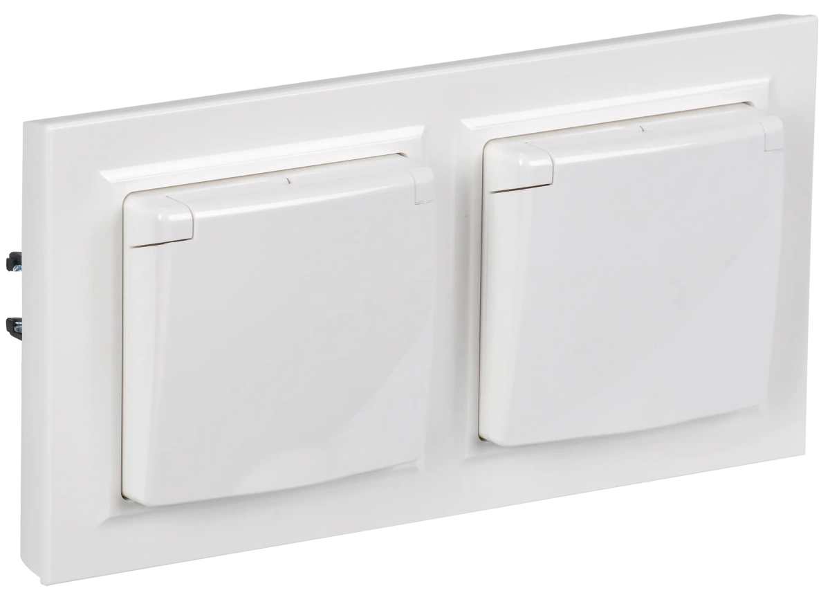 Наименование в каталоге BRITE Комплект 1-местная с заземлением с защитными шторками и крышкой 16А IP44 2 штуки в сборе с двойной рамкой РСбш10-3-44-БрБ белый