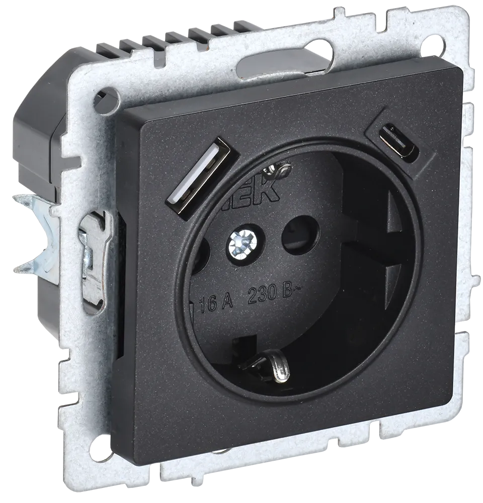 BRITE Роз. с з/к/ш 16А с USB A+C 18Вт РЮш11-1-БрЧ черн. IEK