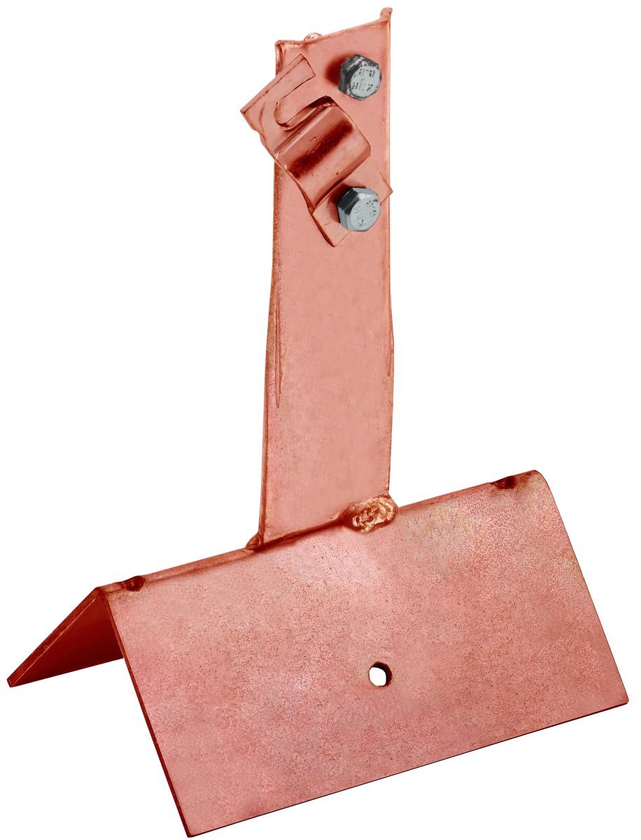 Описание Держатель проводника круглого для конька с болтовым зажимом широкий предназначен для закрепления прутка на коньке скатной кровли. Держатель крепится к кровле при помощи метизов. Зажим проводника происходит при помощи болтового соединения. Материал корпуса - медь.