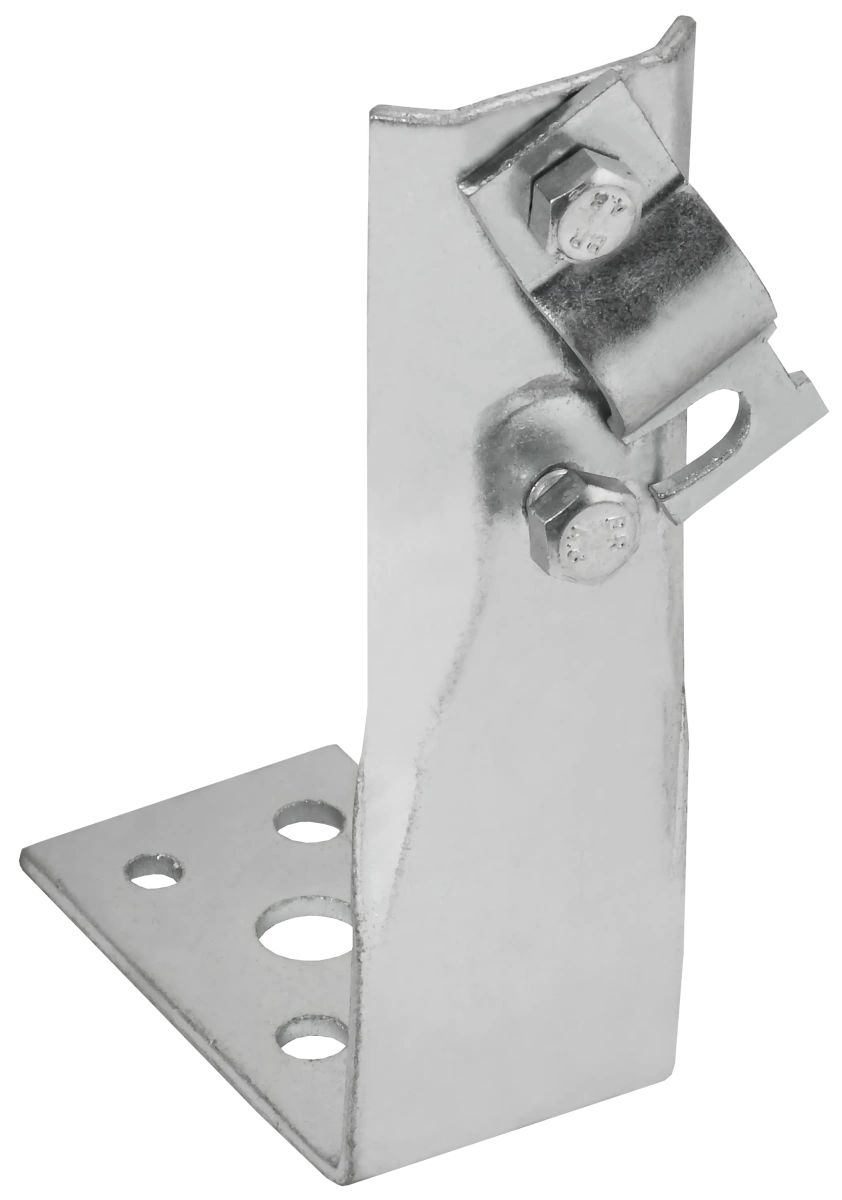 Описание Держатель угловой с болтовым зажимом предназначен для монтажа проводника на горизонтальные, вертикальные или наклонные поверхности. Монтируется на поверхности при помощи саморезов. Зажим проводника происходит при помощи болтового соединения. Материал корпуса - сталь с гальваническим цинковым покрытием.