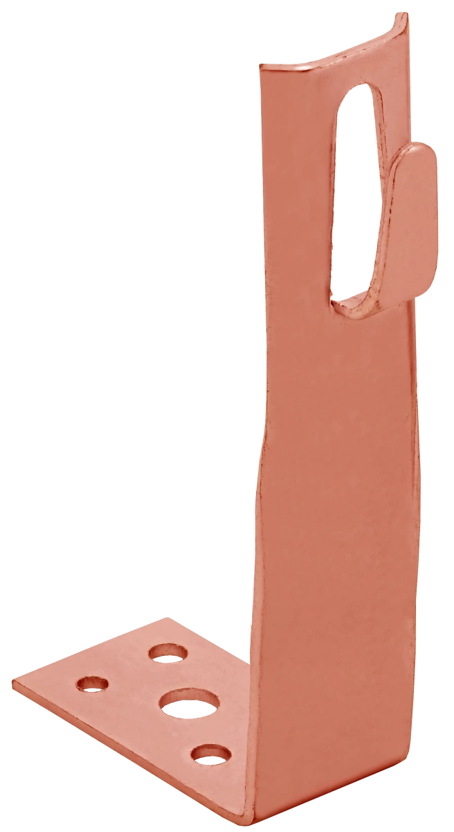 Описание Держатель угловой с безболтовым зажимом предназначен для монтажа проводника на горизонтальные, вертикальные или наклонные поверхности. Монтируется на поверхности при помощи саморезов. Зажим проводника происходит путём загибания язычка держателя. Материал корпуса - медь.