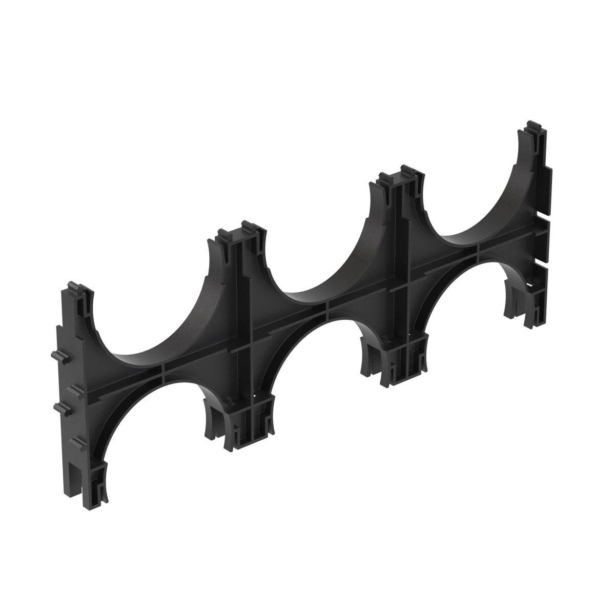 Описание Держатель расстояния (кластер) применяется для сохранения расстояния между гибкими, жесткими, дренажными гофрированными двустенными трубами диаметром 110 мм. Используется для закрепления труб в горизонтальном или вертикальном положении. Препятствует смещению труб при монтаже и эксплуатации. Имеет пазы для крепления трех труб. Для размещения труб при блочном монтаже (в два и более ряда), держатели расстояния могут быть соединены между собой, при помощи специальных защелок. Возможен вариант как горизонтального, так и вертикального размещения блоков труб. Материал - полипропилен. Длина – 441,3 мм, высота – 165,5 мм, цвет – черный, температура эксплуатации – от –40 до +90 градусов Цельсия.