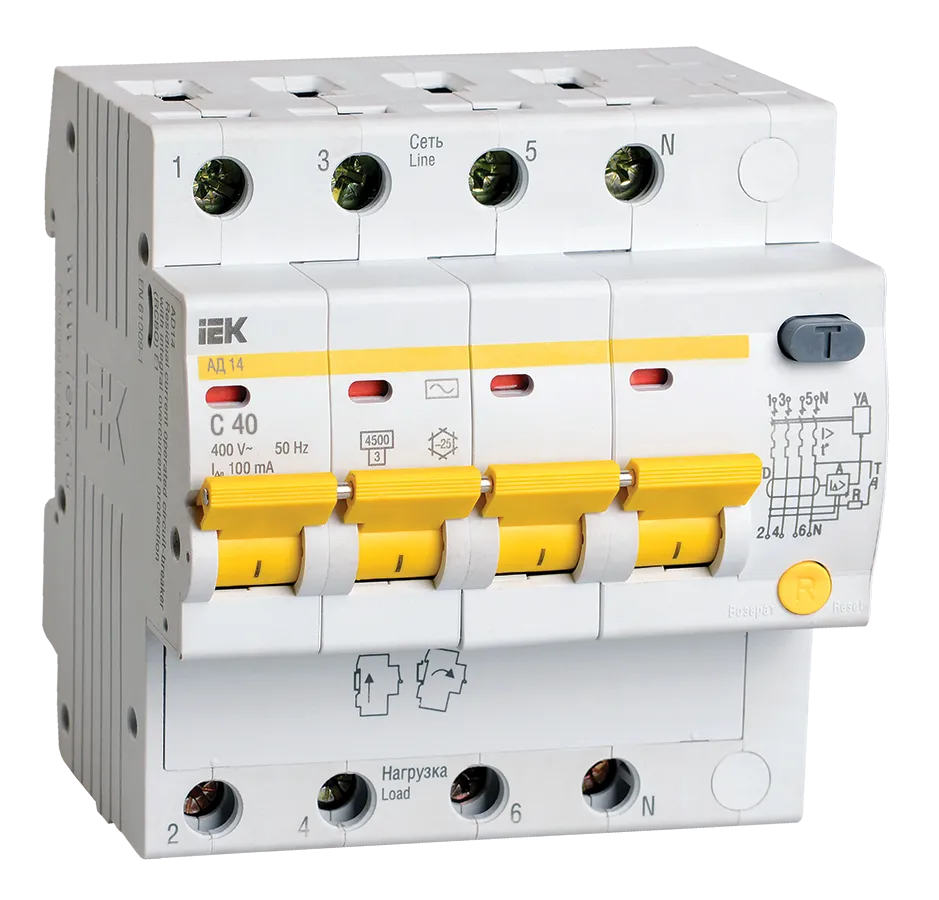 Полные технические характеристики Выключатель автоматический дифференциальный АД-14 4п 40А 100мА С IEK (ИЭК) MAD10-4-040-C-100
