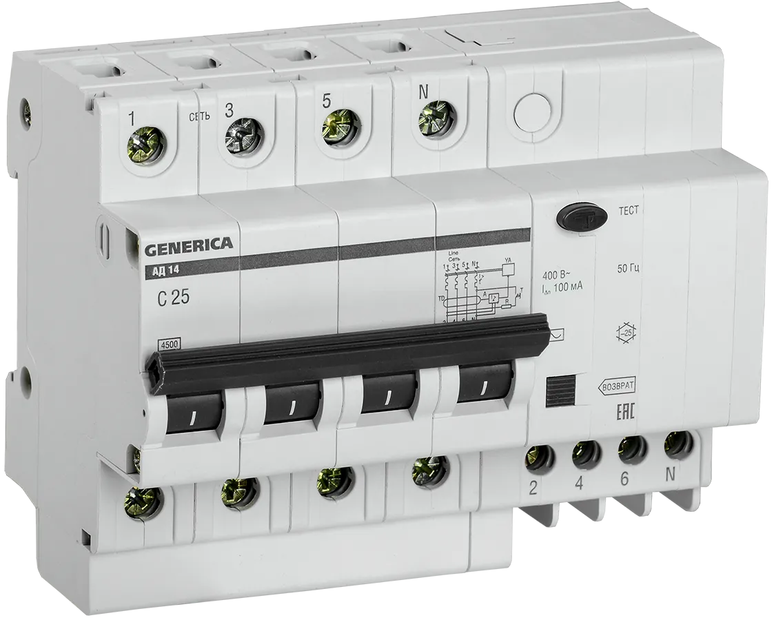 Наименование в каталоге Выключатель автоматический дифференциальный АД14 4Р 25А 100мА GENERICA