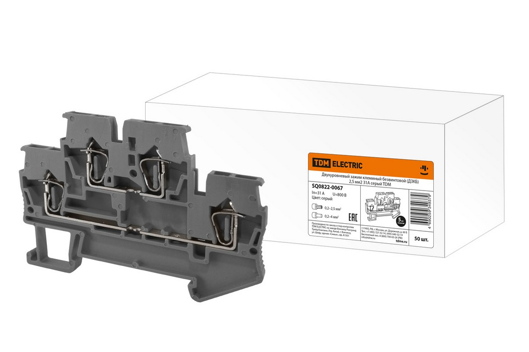 Полные технические характеристики Двухуровневый зажим клеммный безвинтовой (ДЗКБ) 2,5 мм2 31А серый TDM ELECTRIC SQ0822-0067