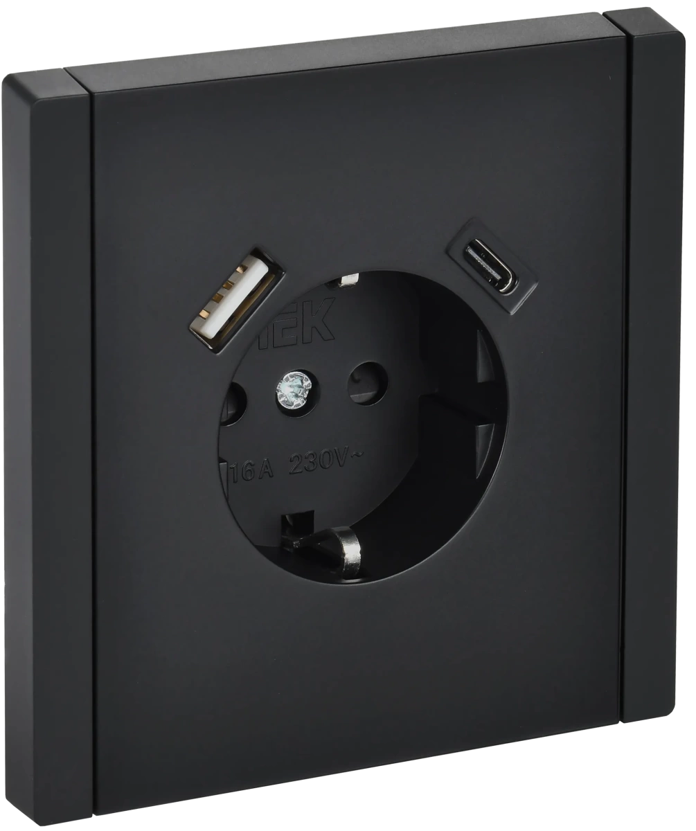 Наименование в каталоге FORTE&PIANO Розетка 1-местная с заземлением с защитными шторками винтовое крепление 16А USB A+C 18Вт FP147 черный IEK