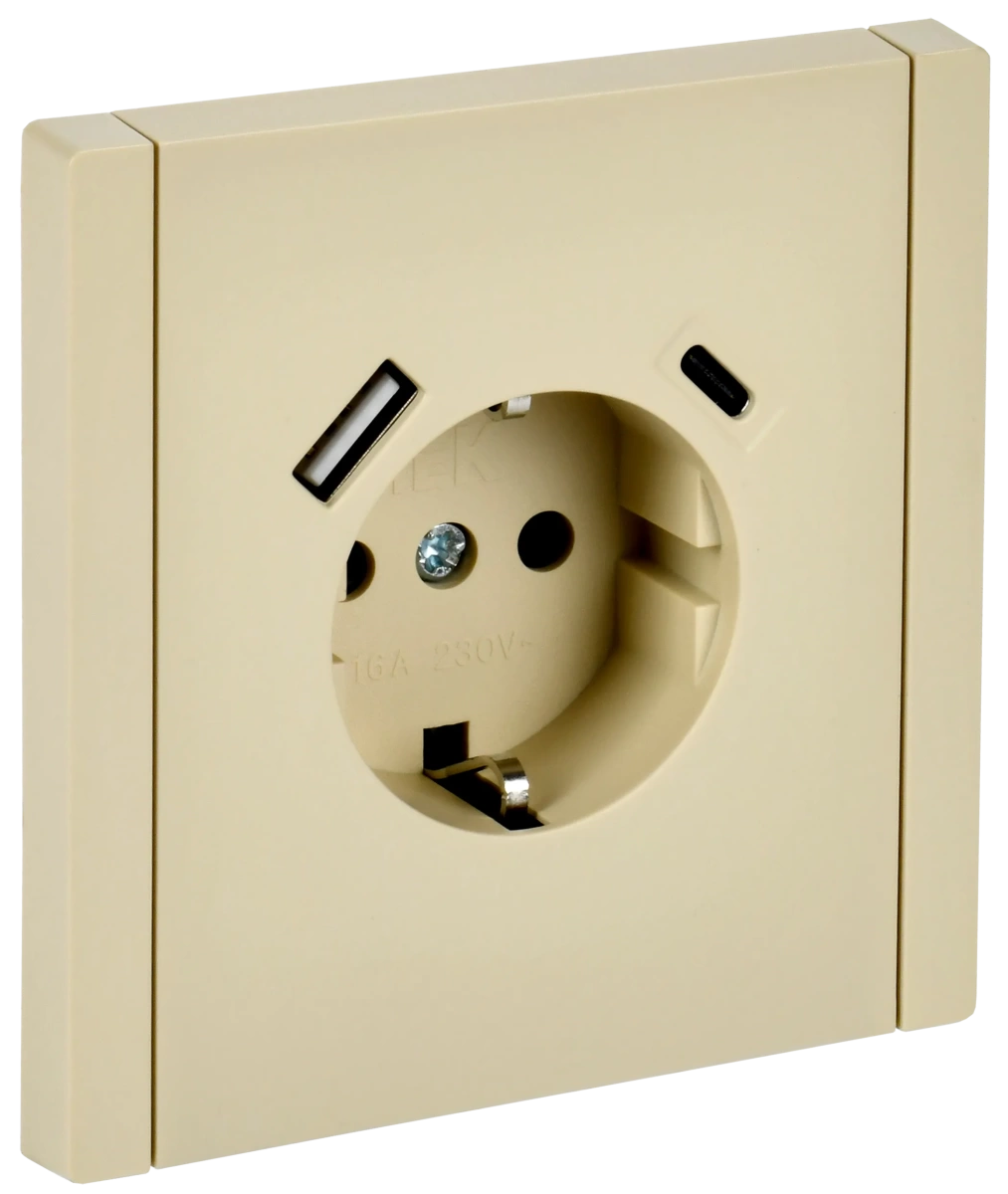 Наименование в каталоге FORTE&PIANO Розетка 1-местная с заземлением с защитными шторками винтовое крепление 16А USB A+C 18Вт FP447 ваниль IEK