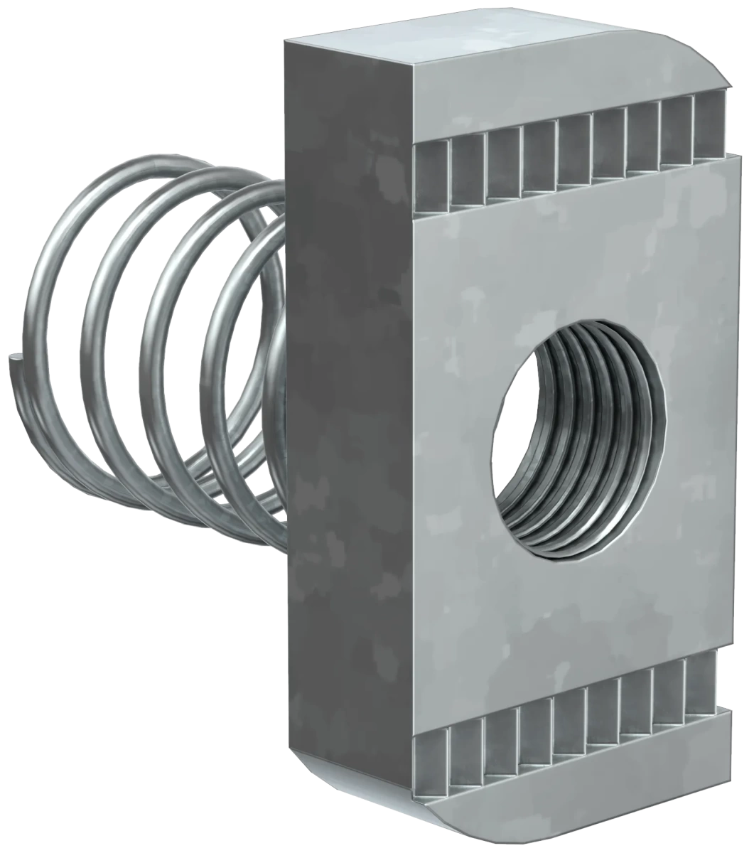 Описание Гайка канальная с пружиной предназначена для крепления элементов STRUT-системы между собой, а также кабельных лотков к STRUT-консолям.Используется с профилем сечения 41х21.