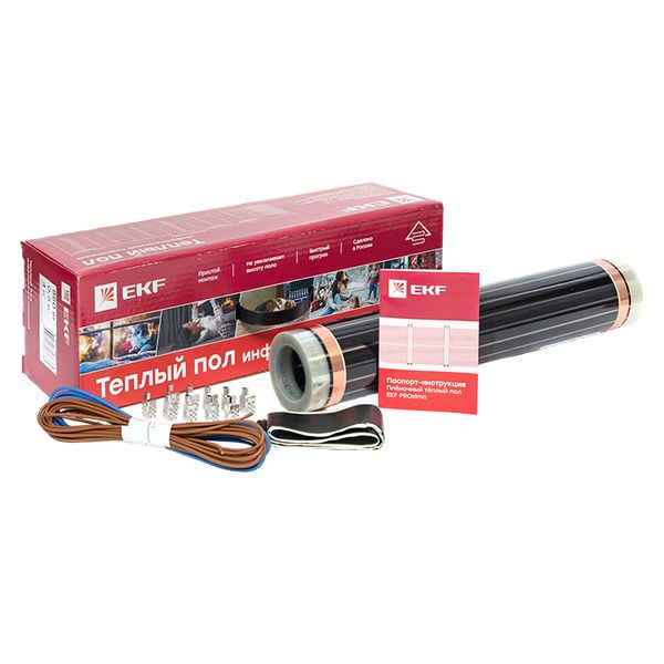 Описание Пленочный теплый пол EKF применяется для `сухого` монтажа без стяжки не только при капитальном ремонте, но и при косметическом. Толщина пленки -0,338 мм. Обеспечивает быстрый и легкий монтаж. Идеально подходит для укладки под ламинат, паркетную доску, мягкое напольное покрытие: линолеум, ковролин. Инфракрасный пленочный теплый пол состоит из следующих элементов: полосы углеродного материала шириной около 1,5 см соединены между собой при помощи медных шин с серебряным покрытием, которые и проводят электрический ток. Нагревательный элемент заламинирован с двух сторон плотным полимером, который не задерживает инфракрасное излучение и обеспечивает отличную защиту от попадания влаги, пробоев и возгорания.