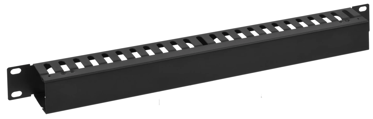 Описание Кабельный горизонтальный металлический организатор 19 с плоской крышкой высотой 1U предназначен для горизонтальной организации кабелей в 19-дюймовых шкафах и стойках.