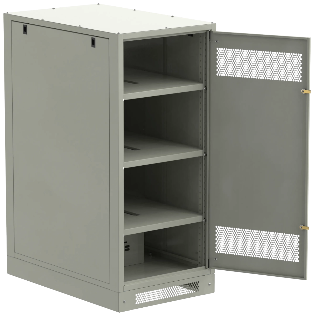 Описание Шкаф аккумуляторный серии LINEA B предназначен для размещения и защиты от несанкционированного доступа аккумуляторных батарей (АБ). Шкафы LINEA B повышенной прочности со сварным каркасом и усиленными полками позволяют размещать АБ до 500 кг. на полке. Вместе со шкафом поставляются полки. Количество полок в комплекте зависит от высоты шкафа. Каркас позволяет размещать полки с шагом 30мм. В полках предусмотрены вырезы для удобства соединения АБ. В нижней части корпуса предусмотрена плата для установки предохранителя-выключателя-разъединителя ПВР. Шкаф аккумуляторный серии LINEA B двухсекционный поставляется на цоколе высотой 100мм. и состоит их двух секций. В месте эксплуатации требуется соединение секций метизами из комплекта поставки. Все металлические части шкафа LINEA B заземлены.