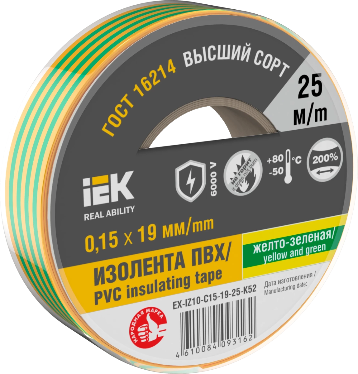 Изолента 0.15х19мм желто-зеленая 25м IEK (ИЭК) EX-IZ10-C15-19-25-K52