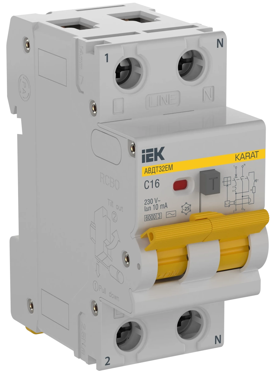 Полные технические характеристики KARAT Выключатель автоматический дифференциального тока АВДТ32EM 1P C16 10мА тип AC IEK IEK (ИЭК) KA-VD14-1-016-C-010-AC