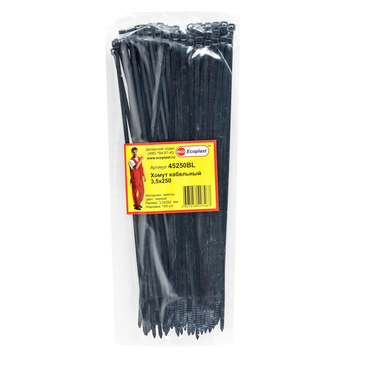 Полные технические характеристики Хомуты кабельные 3,5 х 250мм, цвет черный (1уп = 100шт) Экопласт Ecoplast 45250BL