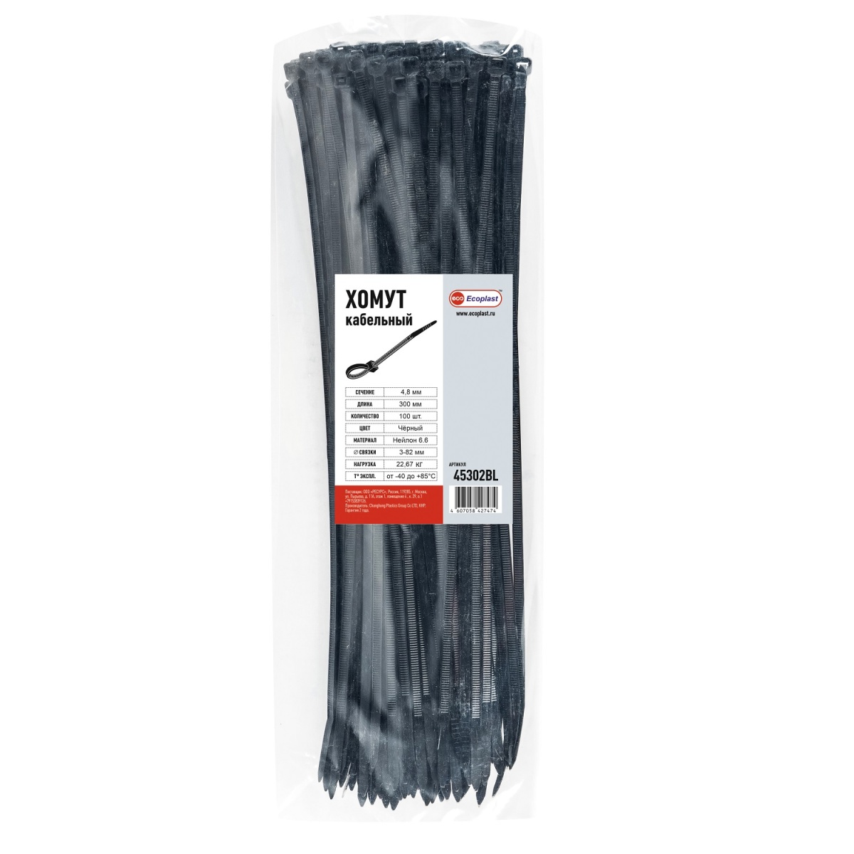 Полные технические характеристики Хомуты кабельные 4,8 х 300мм, цвет черный (1уп = 100шт) Экопласт Ecoplast 45302BL
