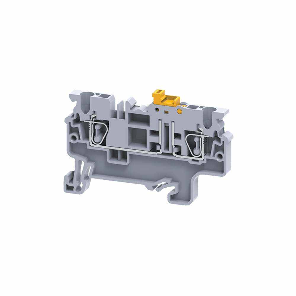 Описание Клемма пружинная с ножевым размыкателем на номинальное сечение проводника 2.5 кв. мм. Клеммы с ножевым размыкателем с выводами безвинтового типа предназначены для установки в распределительных шкафах и щитах систем автоматического управления (САУ) с монтажом на DIN-рейки. Данный тип клемм позволяет легко присоединить круглые медные проводники, номинальным сечением от 0,2 до 2,5 кв.мм, обеспечивая надежный контакт и простоту сборки электрических схем. Особенностью данного типа клемм является возможность разрыва электрической цепи при помощи встроенного рычажка, который имеет механическую связь с ножевыми контактами. Конструкцией данного типа клемм предусмотрены отдельные точки подключения для применения тестового щупа. Клеммы с выводами безвинтового типа применяются в электрических цепях на номинальное напряжение до 1000 В переменного тока.