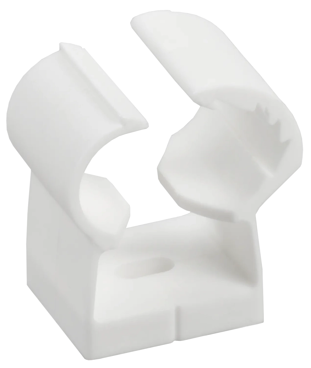 Наименование в каталоге Клипса с фиксатором для гладких труб d=26-32мм белая (18шт/упак) IEK