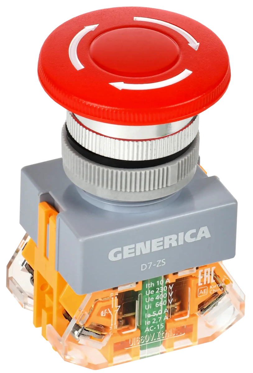 Наименование в каталоге Кнопка D7-ZS Грибок d=22мм 1з+1р пов. с фикс. кр. GENERICA