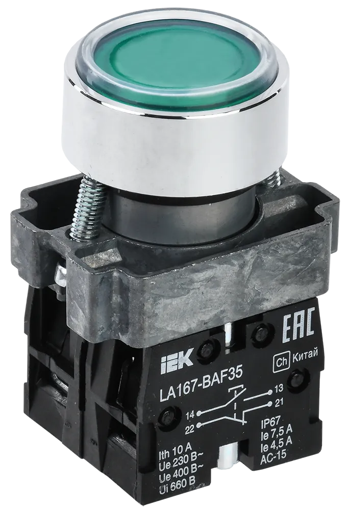 Полные технические характеристики Кнопка LA167-BAF35 d=22мм 1з+1р зеленая IEK (ИЭК) BBT20-BAF35-3-22-67-K06