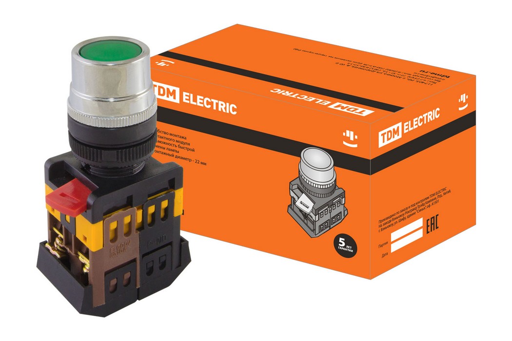 Кнопка ABLF-22 зеленый d22мм неон/230В 1з+1р TDM ELECTRIC SQ0704-0002