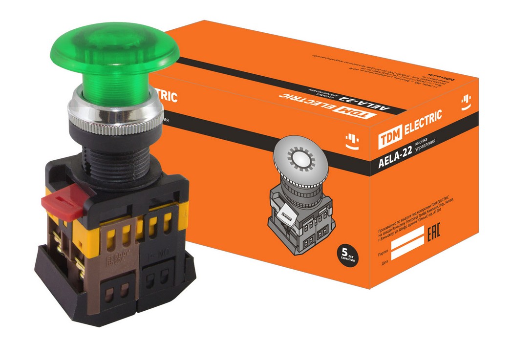 Полные технические характеристики Кнопка AELA-22 Грибок зеленый d22мм неон/230В 1з+1р TDM ELECTRIC SQ0704-0014