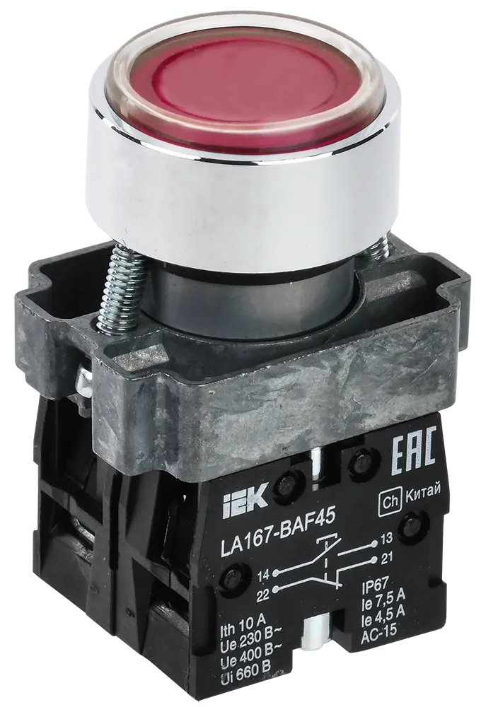 Полные технические характеристики Кнопка LA167-BAF45 d=22мм 1з+1р красная IEK (ИЭК) BBT20-BAF45-3-22-67-K04