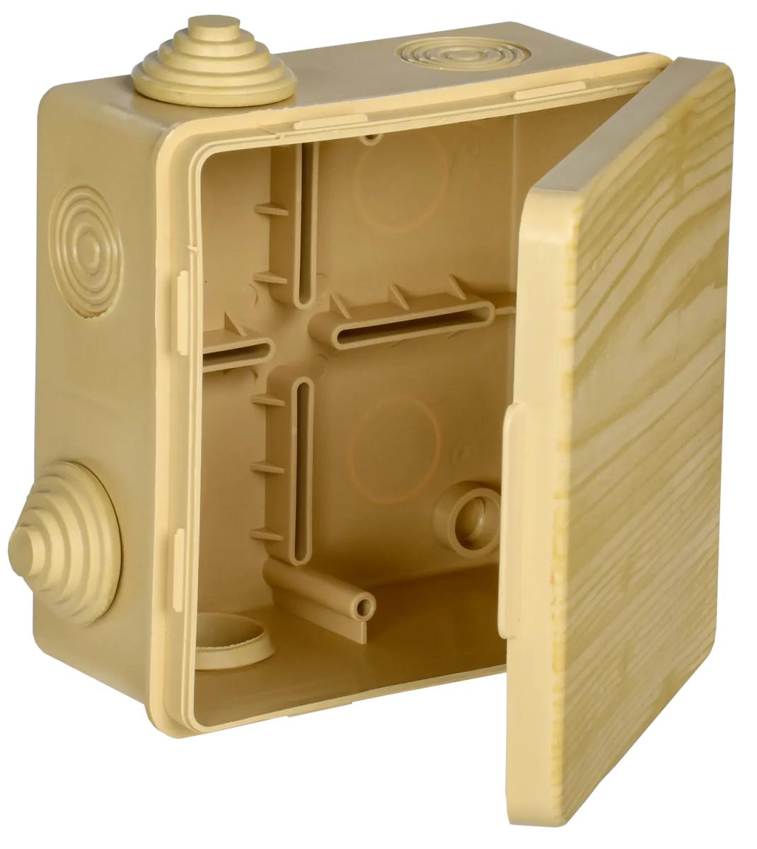 Наименование в каталоге Коробка распределительная КМ 100х100х50мм для наружного монтажа с откидной крышкой IP54 8 вв. сосна