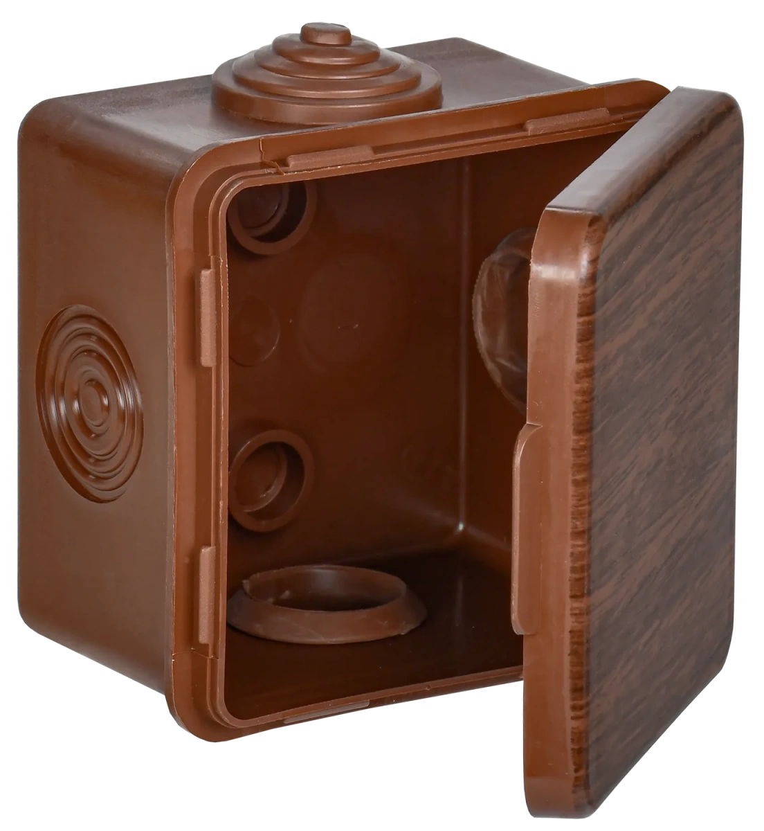 Наименование в каталоге Коробка распределительная КМ 65х65х50мм для наружного монтажа с откидной крышкой IP54 4 вв. дуб