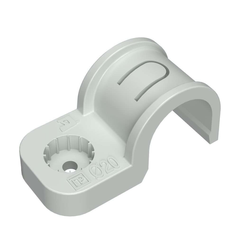 Наименование в каталоге Крепеж-скоба пластиковая односторонняя для прямого монтажа серая в п/э d20 мм (10шт/550шт уп/кор)