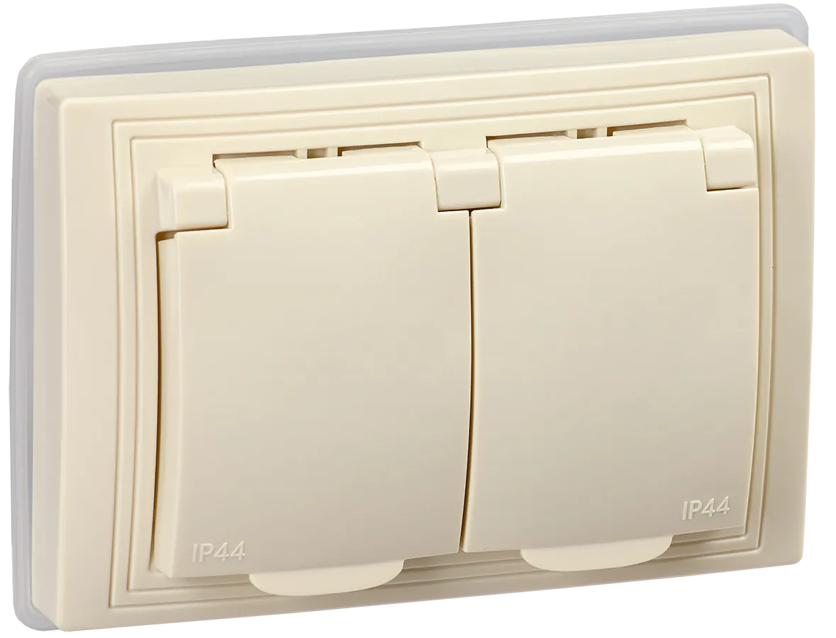 Наименование в каталоге KVARTA Розетка 2-местная с заземлением с защитнымишторками с крышкой 16А IP44 РСбш12-3-ККм-44 кремовый IEK