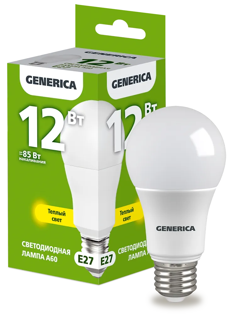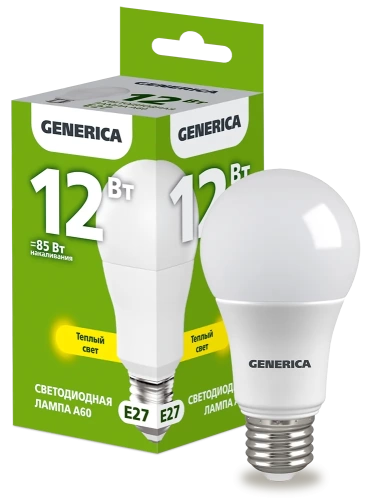 Наименование в каталоге Лампа светодиодная A60 груша 12Вт 230В 3000К E27 GENERICA