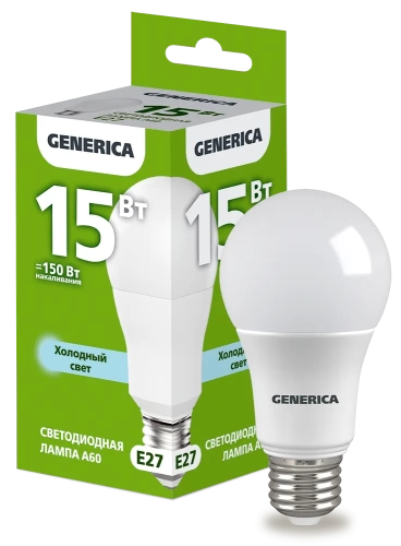 Наименование в каталоге Лампа светодиодная A60 груша 15Вт 230В 6500К E27 GENERICA