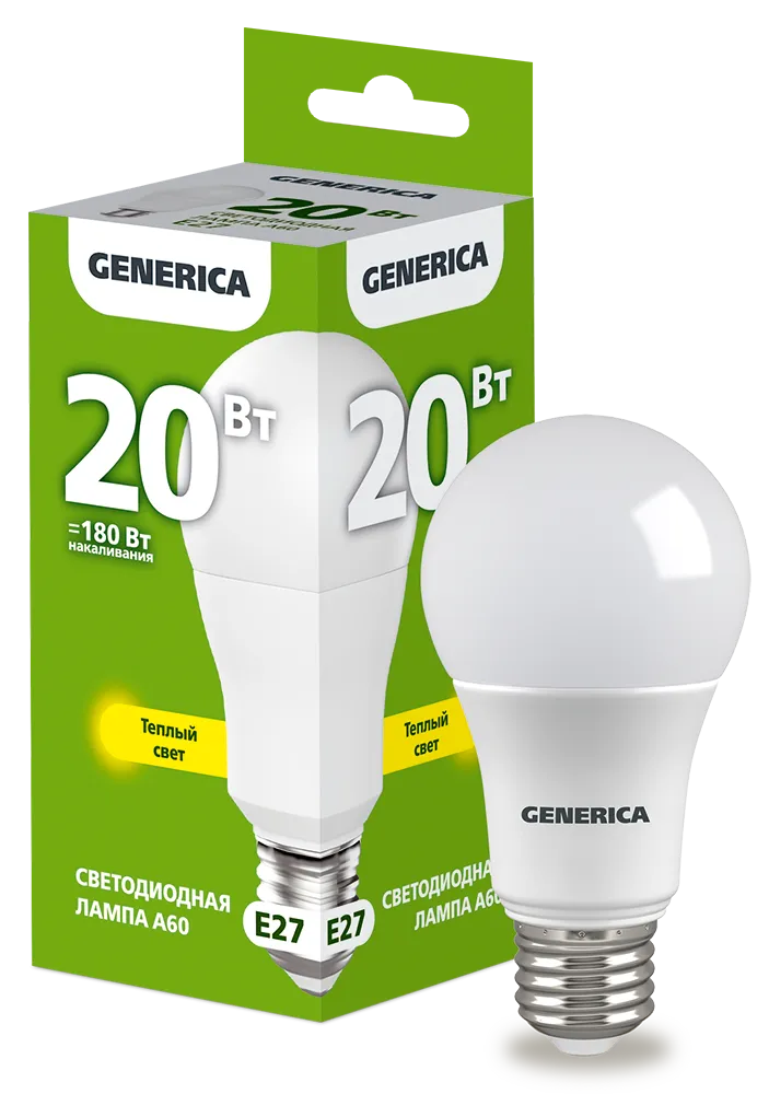 Наименование в каталоге Лампа светодиодная A60 груша 20Вт 230В 3000К E27 GENERICA