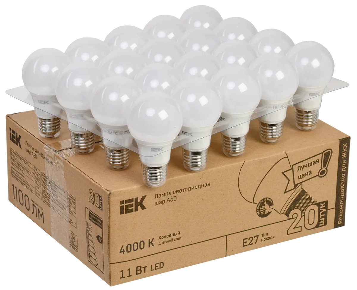 Лампа светодиодная A60 груша 11Вт 230В 4000К E27 (20шт/жкхпак) IEK (ИЭК) LLE-A60-11-230-40-E27-20