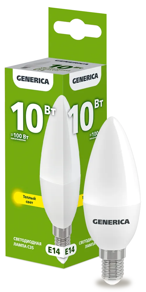 Наименование в каталоге Лампа светодиодная C35 свеча 10Вт 230В 3000К E14 GENERICA